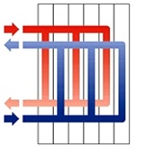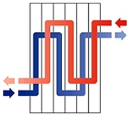 Standard BPHE flow pattern is a single pass arrangement; meaning working fluid flows in a single direction through the unit. A multi-pass arrangement is where working fluid can change its flow path and is sometimes used for low flow rates or extremely close temperature approaches. Other times, multi-pass arrangements are used to provide flexible design configurations in certain applications.