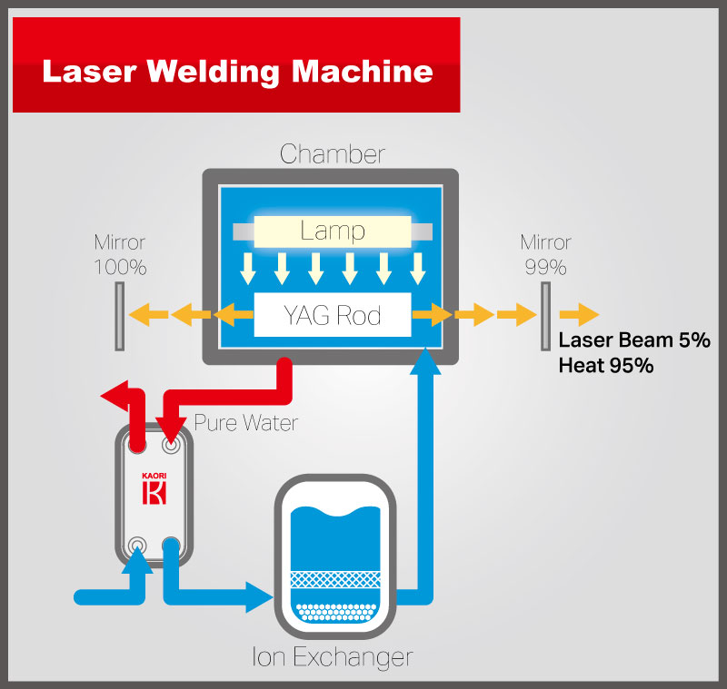 Yüksek teknoloji ürünü lazer ekipmanı ve harici optik parçalar, en uygun işletim sıcaklıklarını muhafaza etmek için soğutma gerektirir. Daha küçük kapasiteli lazer ekipmanında genellikle, ısı eşanjöründe dolaşan suyu soğutmak için hava soğutma sistemleri kullanılır. Daha büyük lazer ekipmanında, su sıcaklığını korumak için soğutucu kullanılır ve su dolaşımı için bir pompa gerekir. Deiyonize su, hassas elektronik bileşenlerden atık ısıyı uzaklaştırmak için yaygın şekilde kullanılan bir soğutucu olup bakırla kullanıma uygundur.